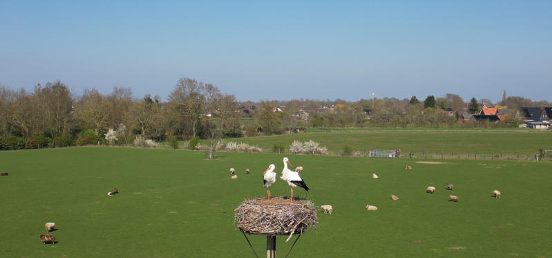 “Ze zijn terug,” riep iemand. We keken omhoog en zagen twee ooievaars cirkelen boven het oude nest op de paal bij de dijk.